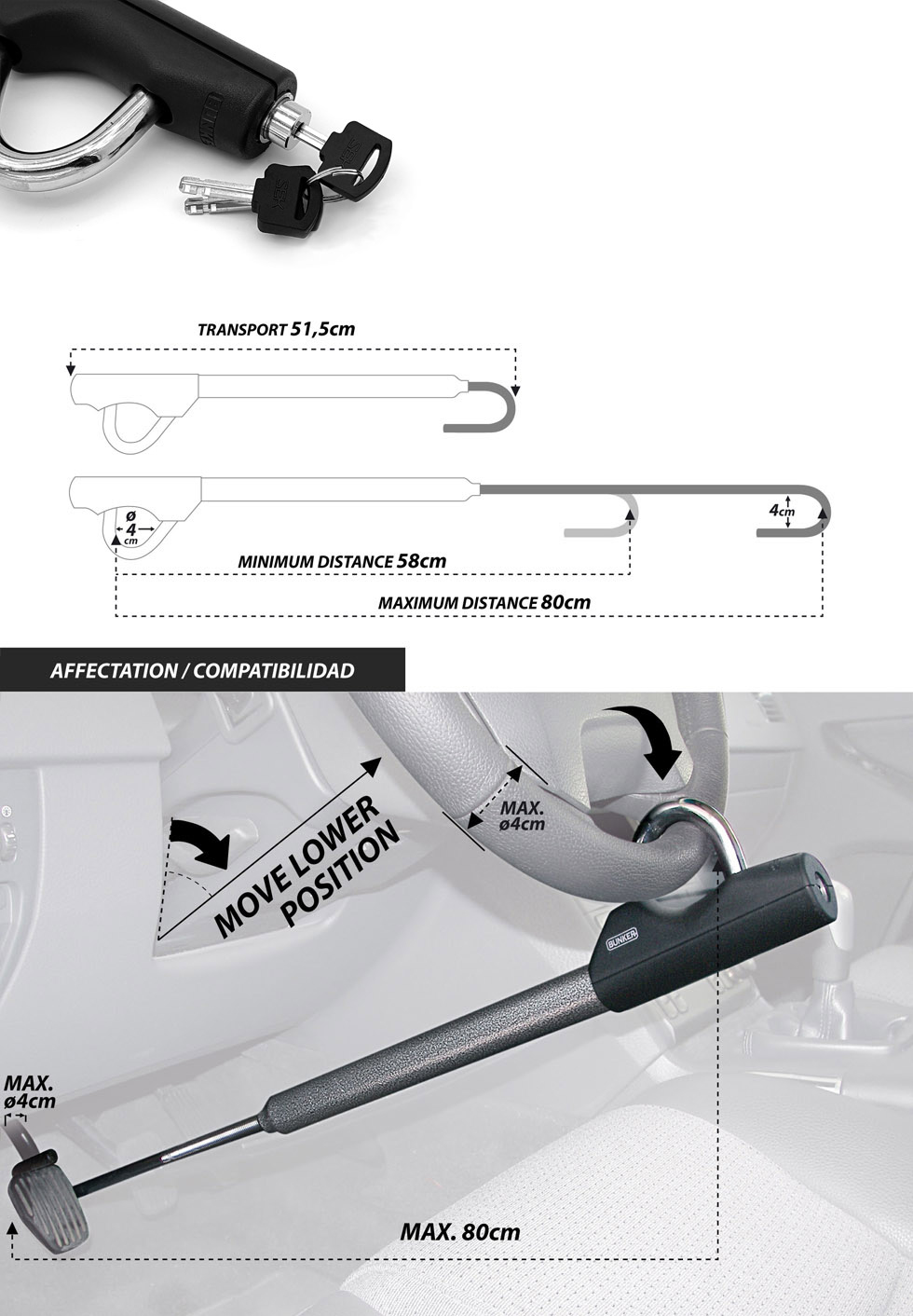 Exclusivo sistema extensible con una longitud maxima de 83cm apto para todo tipo de vehiculos, incluso 4x4.